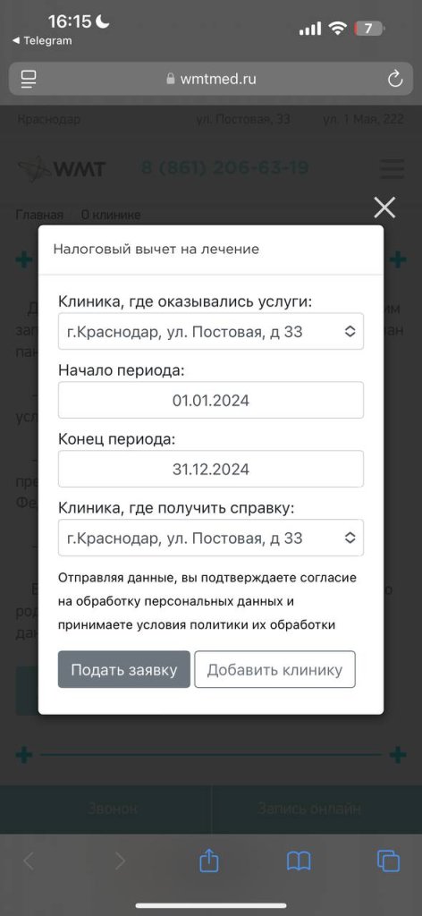 3. В поле «Клиника, где получить справку» необходимо выбрать из списка ту клинику, где вы планируете забирать документы, подготовленные для подачи в налоговую. Если в течение выбранного периода пациент посещал несколько филиалов клиники, то в конце формы нужно нажать кнопку «Добавить клинику» и повторно заполнить все строки, только выбрав при этом уже другую клинику.