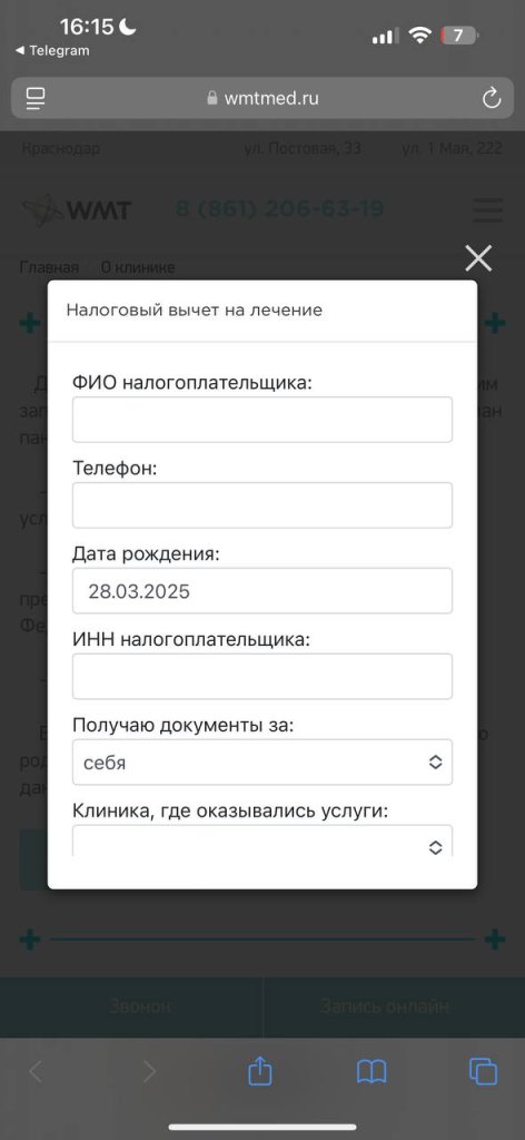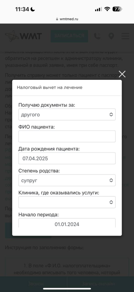 1. В поле «Ф.И.О. налогоплательщика» необходимо вписывать того человека, который будет подавать декларацию 3-НДФЛ и на банковский счет которого будут перечислены денежные средства. Это можете быть сам пациент, либо его супруг/супруга, дети (старше 18 лет), родители. В полях «Телефон», «Дата рождения», «ИНН налогоплательщика» указываются данные этого человека.