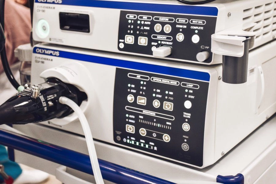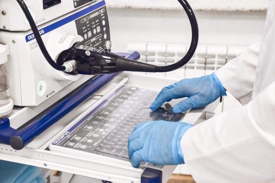 Для очистки эндоскопов мы используем моечные машины фирмы Olympus (Япония). Это автоматизированная система дезинфекции, которая очищает приборы и проверяет на герметичность. Пока один эндоскоп в работе, другие проходят очистку.
